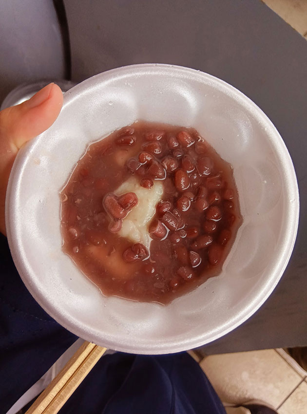 風成は子供の頃に1度この餅つきに参加した後は十何年も参加できていなかったのですが、社会人生活に慣れて余裕ができたこともあり、ここ数年は積極的に祭りに参加しています。餅つきの際は見ず知らずの人と隣になることが大半なのですが、力を合わせて何度もロープを引っ張ったり離したりするうちに自ずと息が合い一体感が出てくるので不思議なものです。餅つきに参加している人のみならず、沿道で見守っている観客達も囃子に合わせて手拍子を打つことで餅つきを盛り上げてくれていました。餅つきの工程が進むにつれて運営スタッフや餅つき参加者、その他の観客など会場にいる全員が段々と一つになってゆき高揚感に包まれた餅つきとなりました。餅つきが終わると、参加者に配られる優先的にお汁粉がもらえる引換券を受け取って列に並びます。しばし待った後にお汁粉と割りばしを受け取り、近くの空いている場所に腰を下ろしてお汁粉をいただきました。しっかりとした歯ごたえ、米の風味があふれるお餅に小豆たっぷりの甘い汁が絡んでそれはそれは最高においしいお汁粉でした。ロープを引いたり離したりの後で疲れた体に染み渡るこの味は、年に数日しか食べられない最高の岩見沢レアグルメと言っても差し支えないでしょう。